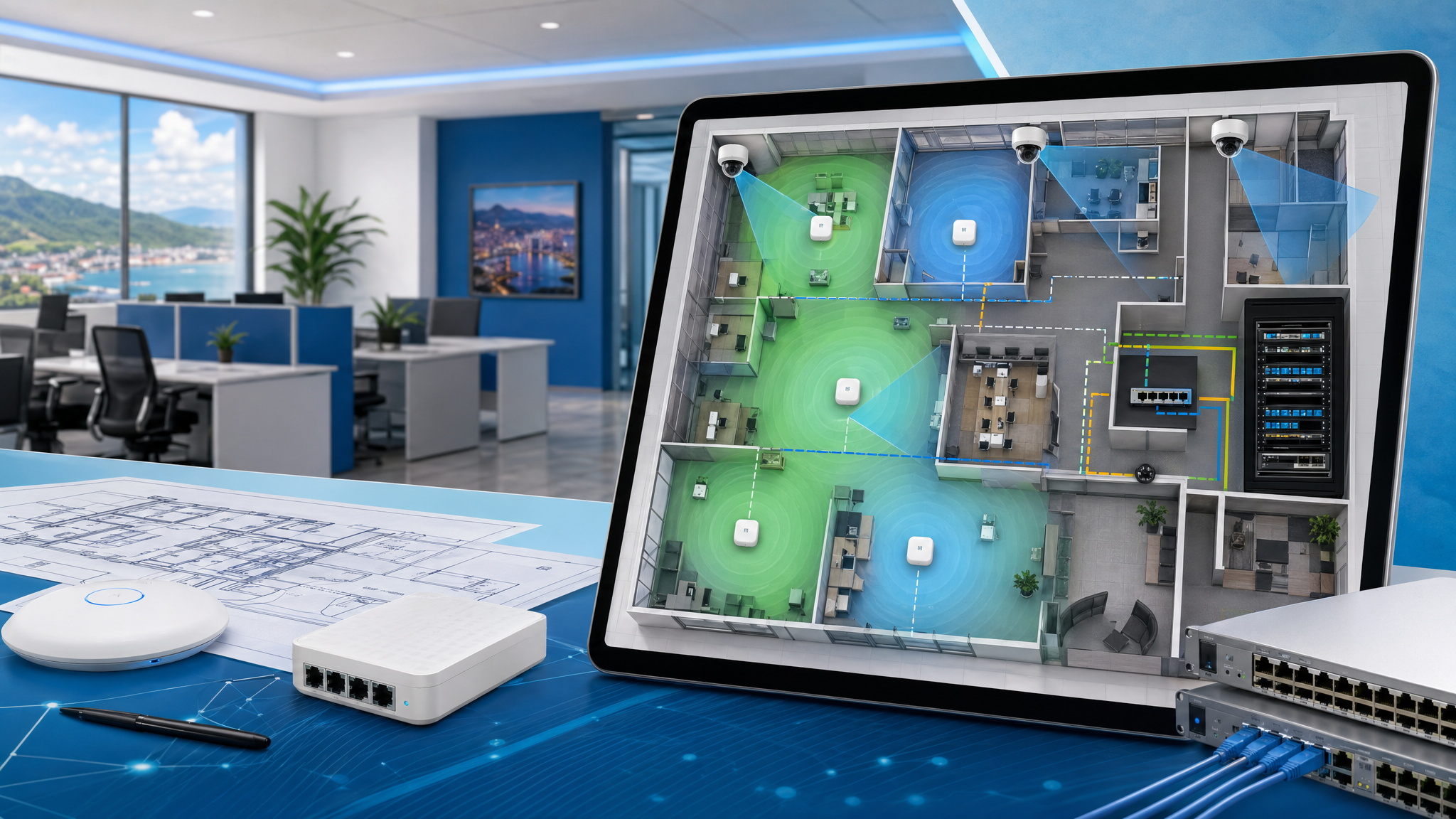 That matters because Wi-Fi, switching, cameras, access control, and cabling are connected decisions. If the camera locations need PoE, the switch design must account for power and ports. If staff Wi-Fi and guest Wi-Fi need separation, the firewall and VLAN design must be considered. If a future tenant, department, or branch is likely, the network should leave room to grow.